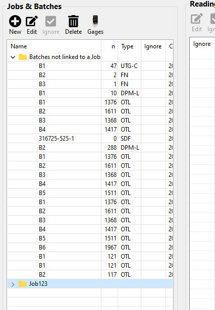 Displays a list of readings contained within the currently selected batch. Double click on a reading to display and edit its attributes (add a picture and note, ignore the reading). See: Readings