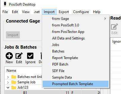 To import a Prompted Batch Template previously created in PosiSoft Desktop, select Prompted Batch Template in the Import Menu.