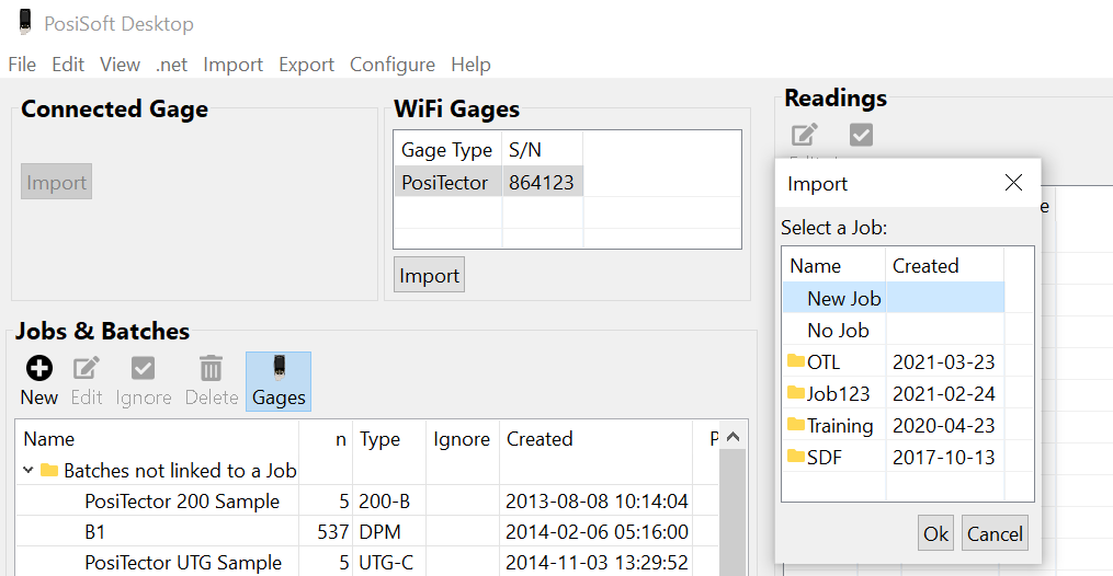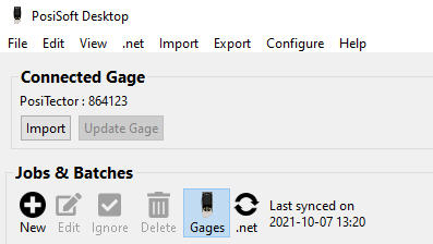 2. When successfully connected, a "Connected Gage" section will appear as shown below. Select "Import" to copy batches from the gage into PosiSoft. Alternatively, select "Import > from Gage" and select your connected gage to initiate the transfer. Imported batches will display within the selected batch or in the Batches not linked to a Job section.