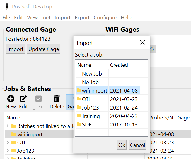 When successfully connected, a Connected Gage dialog box will appear as shown below. Select Import to copy batches from the gage into PosiSoft. Alternatively, select Import > from Gage and select your connected gage to initiate the transfer. Imported batches will display within the Jobs & Batches section.