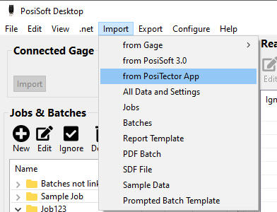 Select Import to copy batches from the connected gage into PosiSoft Desktop. See Import