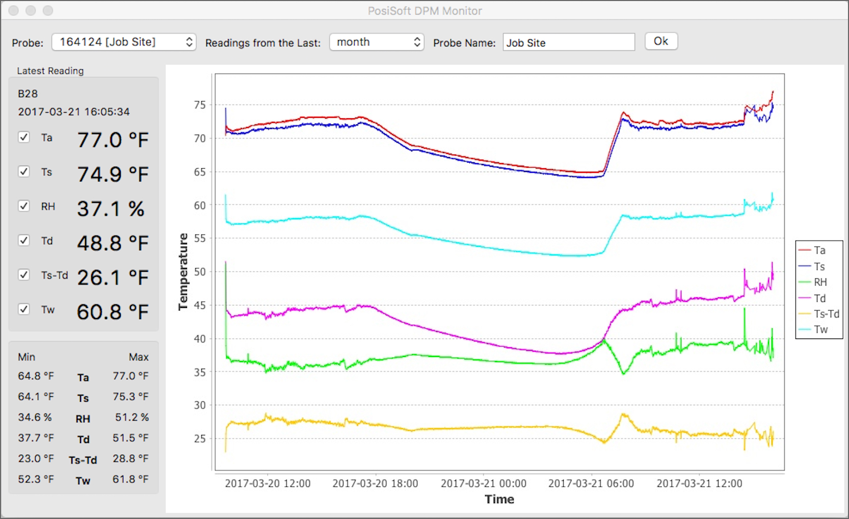 PosiTector DPM Monitor feature allows continuous monitoring of one or more dew point meters in a centralized location. Graphs allow you to spot climatic trends and cycles quickly.